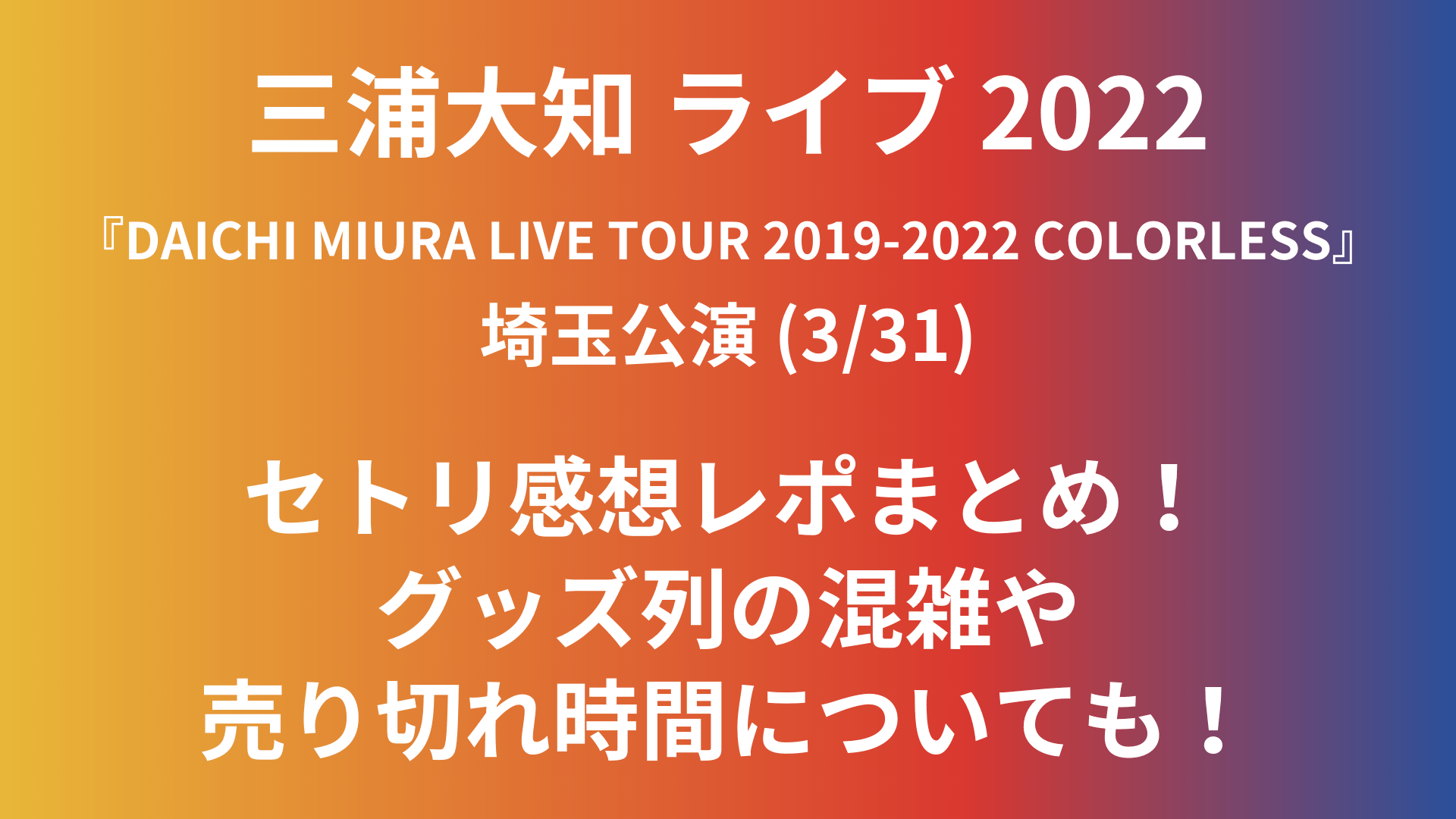 今回のツアータイトルは「DAICHI MIURA LIVE TOUR 2019-2022 COLORLESS」で、2022年3月31日(木)の公演会場は「戸田市文化会館」となっています。
