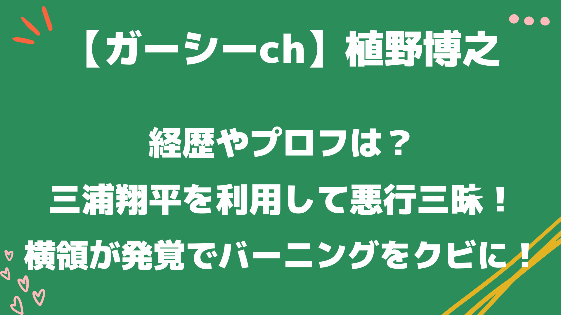 植野博之さんは芸能プロダクション「バーニング」のマネージャーであり、三浦翔平さんの元担当マネージャーだったことがガーシーchで暴露されています。