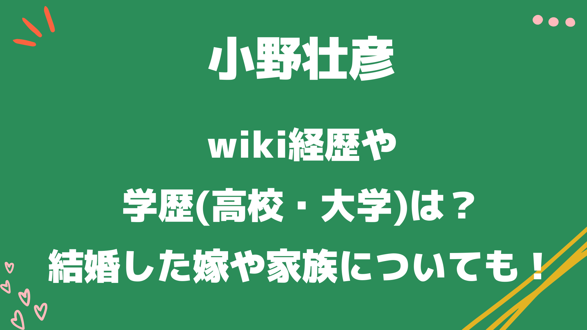 今回は「小野壮彦のwiki経歴や学歴(高校・大学)は?結婚した嫁や家族についても調査!」と題して以下についてまとめています。