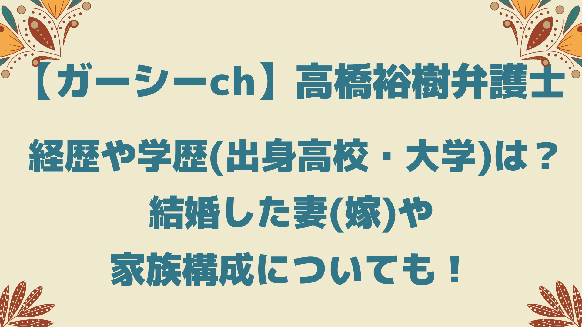 今回は「高橋裕樹弁護士の経歴や学歴(出身高校・大学)は?結婚した妻(嫁)は?家族構成についても!」と題して以下についてまとめています。