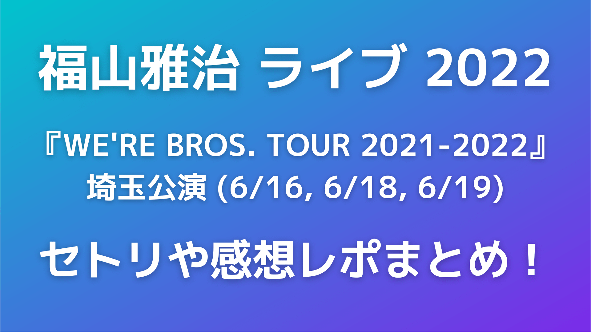 福山雅治さんの全国ツアー「WE’RE BROS. TOUR 2021-2022」の埼玉公演が6/16(木)、6/18(土)6/19(金)に開催されます。