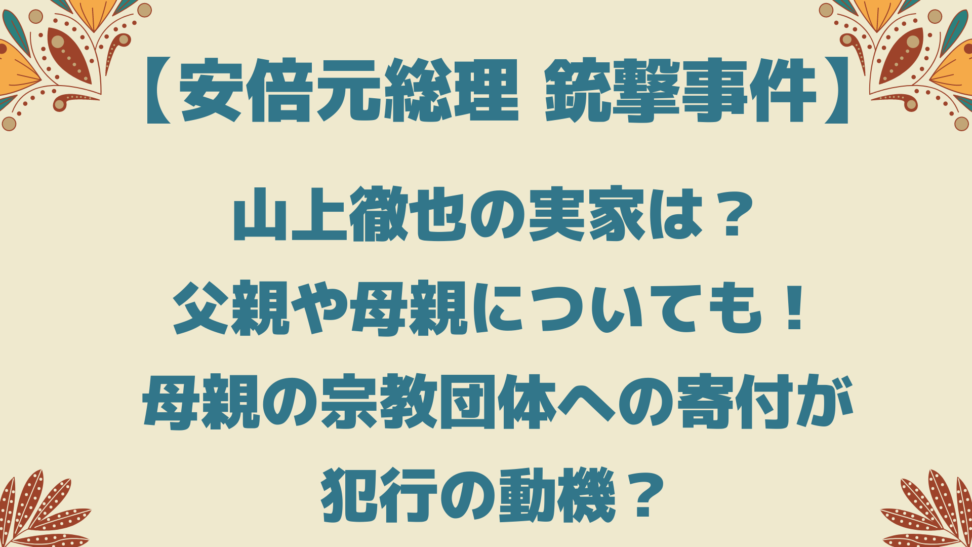 今回は「山上徹也の実家は?父親や母親の特定宗教団体への寄付が犯行の動機?」と題して以下についてまとめています。