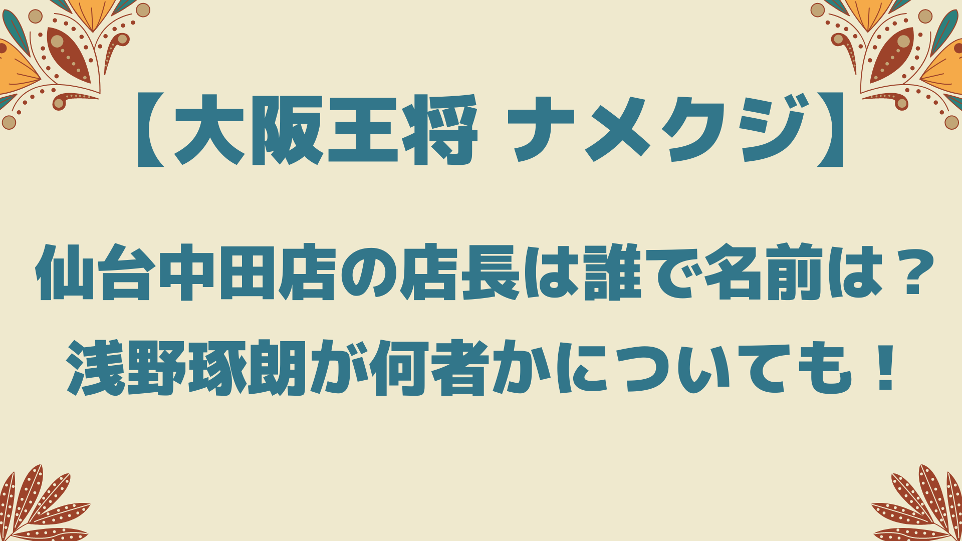 今回は「大阪王将仙台中田店の店長は誰で名前は?浅野琢朗が何者かについても!」と題して以下についてまとめています。