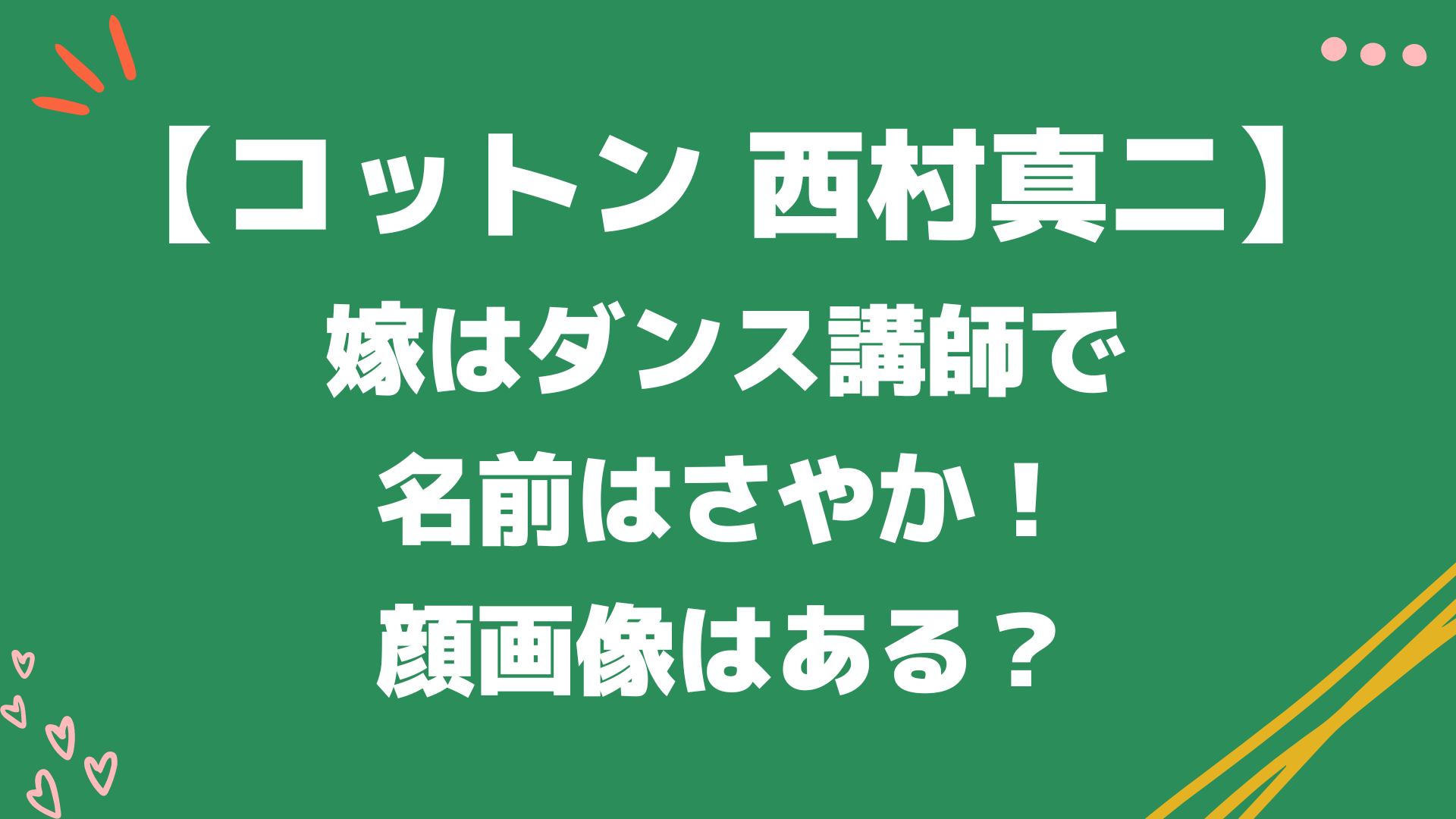今回は「コットン西村真二の嫁はダンス講師で名前はさやか!顔画像はある?」と題して以下についてまとめています。