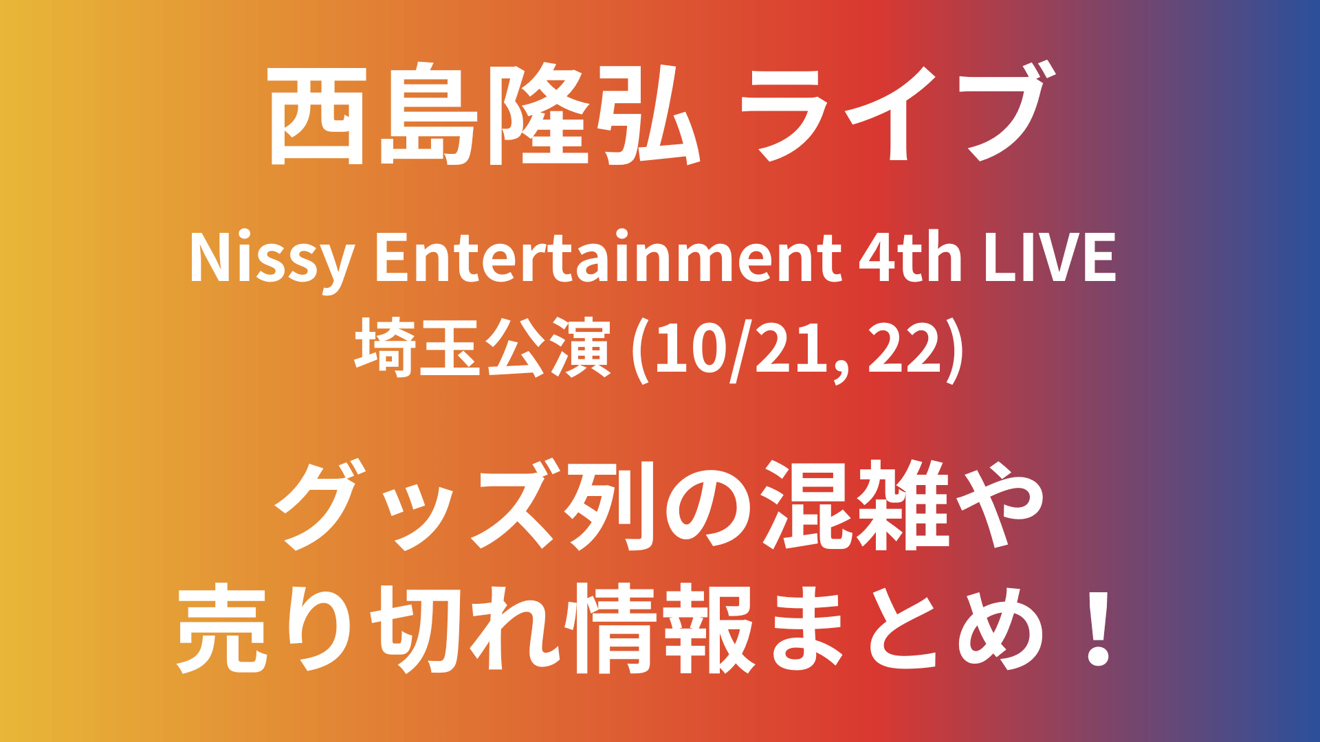 西島隆弘(Nissy)ライブ2022埼玉での公演のグッズ列の混雑状況や売り切れについて気になりますよね。
