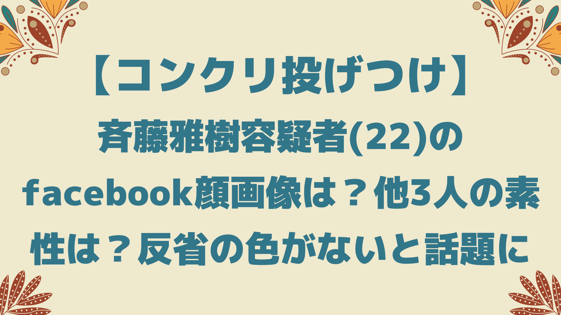今回は「斉藤雅樹容疑者(22)のfacebook顔画像は?他3人の素性は?反省の色がないと話題に」と題していかについてまとめています。